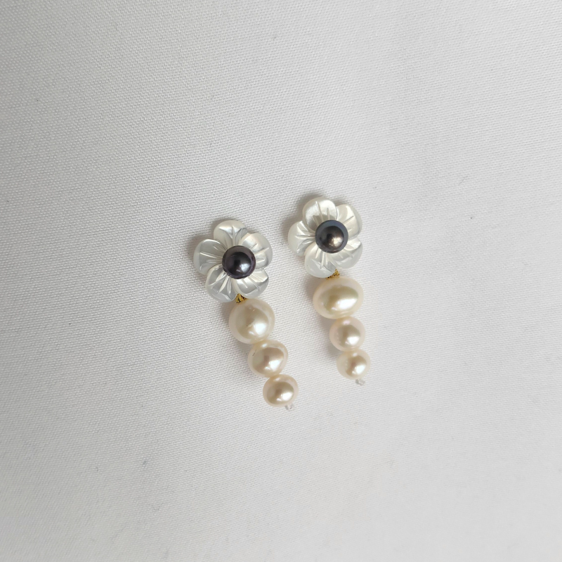 Our Peony Earrings, featuring a delicate white mother-of-pearl flower