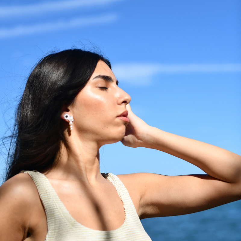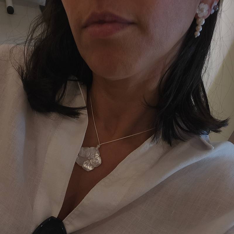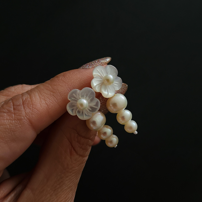Our Peony Earrings, featuring a delicate white mother-of-pearl flower