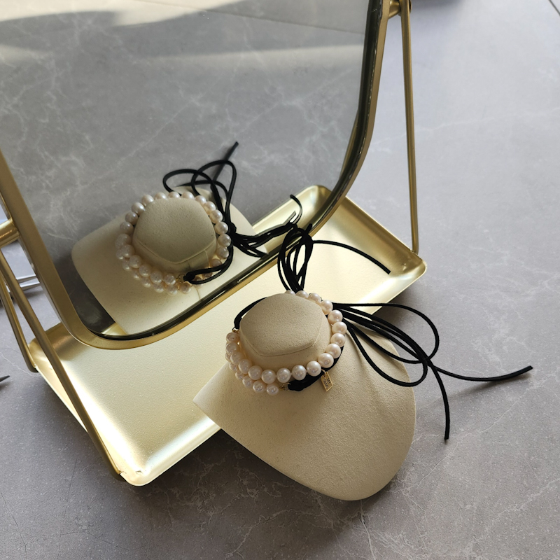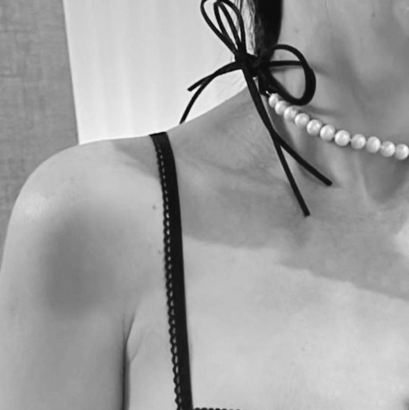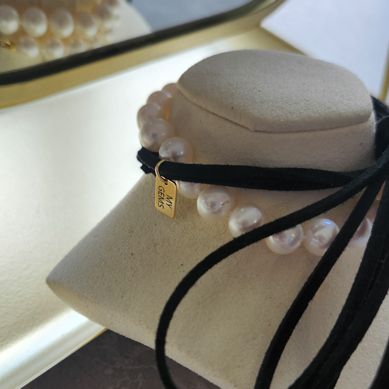Choker necklace with open ends made of fresh water pearls on black soft suede leather cord